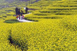 游人在云南羅平觀賞油菜花。