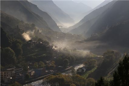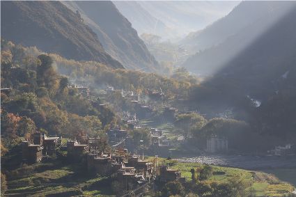 落日將最后一道霞光在山尖劃過,暗夜便裹挾這寒意搖動(dòng)起山林中的樹木。風(fēng)漸緊,那已經(jīng)稀稀落落的樹葉隨著風(fēng)的韻律,跳起歡快的鍋莊,仿佛在告別這一年的繁華。突如其來的大雪,給丹巴的二月涂上白色的記號(hào)。從山尖到院前的樹上,一溜兒雪白,正應(yīng)了“忽如一夜春風(fēng)來,千樹萬樹梨花開”的情景,讓人忍不住伸出手指看看這花是真是假。大雪過后,陽光如約而至撒滿藏寨,金色陽光和蒸騰的白霧縈繞在雪白的山頭,與山下的古碉藏寨,河畔的清流巧妙地構(gòu)成一幅絕美畫卷,讓人仿佛身處仙境。吸足了養(yǎng)分的柳樹終于抽出綠芽送來春天的信號(hào),那柳條兒在細(xì)風(fēng)吹拂下宛如少女對(duì)鏡梳妝,在陽光下顯得無比溫柔,讓人不禁想貼近它們,感受這溫暖又靜謐的溫柔。