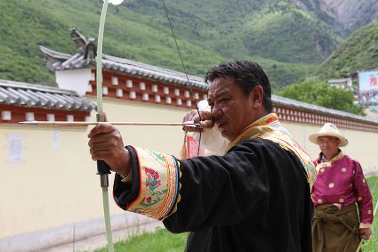 射箭也是德欽以及周邊些村落的重要民俗活動(dòng)之一,村里的男人們盛裝出場(chǎng),在射箭場(chǎng)彎弓搭箭,從7、8歲小孩到50多歲的老人都要參加射箭,甭管你射得中靶子與否,笑聲里充滿了和諧和喜慶。德欽縣的江坡村,在每年桃花盛開(kāi)的季節(jié),都要開(kāi)展盛大的射箭節(jié),全縣的射箭愛(ài)好者都前來(lái)一顯身手,康巴漢子們不僅射得一手好箭,還得會(huì)拉弦子,悠揚(yáng)的弦子聲可以給射手們加不少分,活動(dòng)的初衷就是要求藏族男人必須能文能武。弦子聲聲,唱出了藏家百姓美好的生活,村里的女人戴上了各種金銀首飾,男人們手拉弦子,盡情歡暢的唱著、跳著,村里的老人們是忠實(shí)的觀眾,看著大家在舞場(chǎng)里的步子,他們也跟著笑得合不攏嘴,有些年輕人還不時(shí)跑出舞場(chǎng)到場(chǎng)邊的老人們面前請(qǐng)教弦子的唱詞,老人們總是不厭其煩的傾囊相授,因?yàn)樗麄冊(cè)?jīng)也是弦子舞場(chǎng)的“明星”。