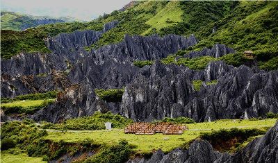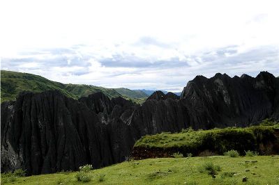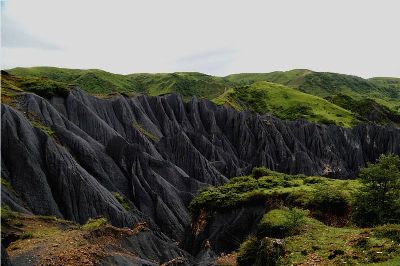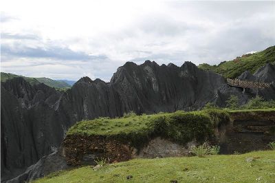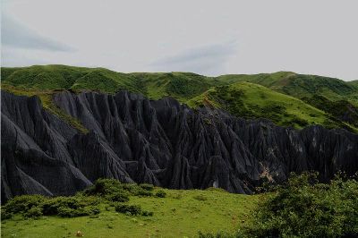 墨石公園,是中國唯一高原石林景觀,被譽(yù)為“中國最美景觀大道第八美 ”。受第四紀(jì)新構(gòu)造運動影響,隨著青藏高原的隆起,鮮水河斷裂帶中的巖石受到擠壓、剪切、破碎、糜化,形成糜棱巖石林。石林含丐鹽,受空氣濕度影響,干燥季節(jié)呈淺灰色、淺藍(lán)色,濕潤季節(jié)呈滄黑色,因此又稱之為變色石林。