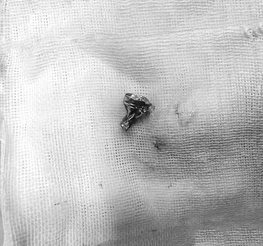 手術(shù)于1月5日13時(shí)開始,在醫(yī)院呼吸與重癥醫(yī)學(xué)科、消化胃腸鏡室的支持下,兒科與麻醉科醫(yī)護(hù)人員密切合作,兒科醫(yī)生劉勤、張雪瓊冷靜操作、沉穩(wěn)手術(shù),最終將異物成功取出。經(jīng)仔細(xì)檢查,異物為一扭曲變形的鉛筆頭鋁箍。
