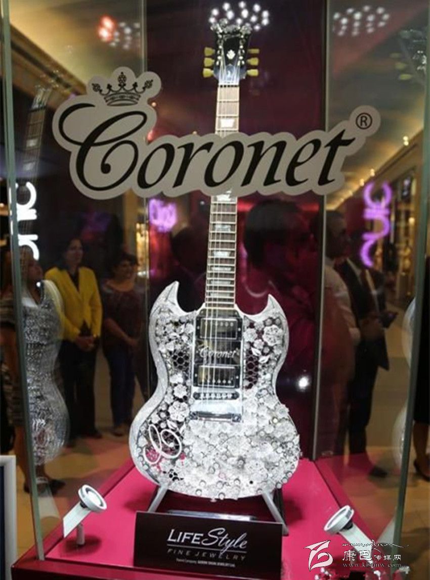 這件鉆石吉他由中國(guó)香港著名音樂(lè)人雷頌德設(shè)計(jì),周大福珠寶公司與吉布森吉他公司合作出品,用400克拉鉆石和1.6公斤黃金鑲嵌打造而成,總價(jià)值達(dá)200萬(wàn)美元(約合1300萬(wàn)元人民幣)。