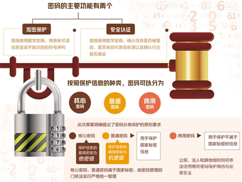 國家密碼管理局局長李兆宗作草案說明時說,密碼工作是黨和國家的一項特殊重要工作,直接關(guān)系國家安全。密碼在我國革命、建設(shè)、改革各個歷史時期,都發(fā)揮了不可替代的重要作用。進(jìn)入新時代,密碼工作面臨著新的機(jī)遇和挑戰(zhàn),擔(dān)負(fù)著更加繁重的保障和管理任務(wù),制定一部密碼領(lǐng)域綜合性、基礎(chǔ)性法律,十分必要。