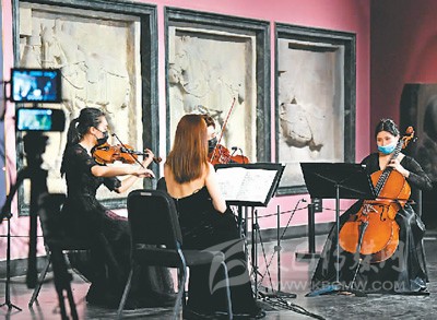 在西安碑林博物館昭陵六駿石刻前,西安交響樂團(tuán)“弦上莫奈四重奏”為“云上國(guó)寶”音樂會(huì)彩排。