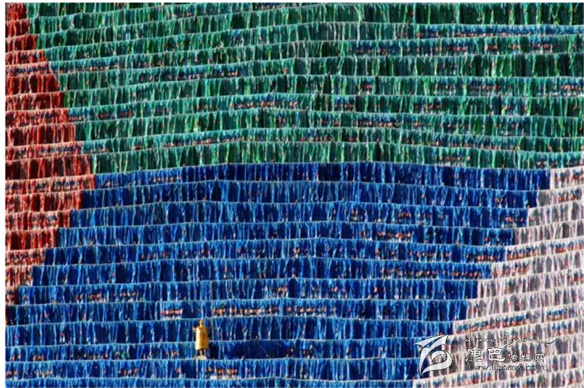 各種顏色的經(jīng)幡組成了六字箴言的第一個字“嗡”掛在山上,面積約有100多平方米,可以與拉薩大昭寺的大唐卡相媲美!