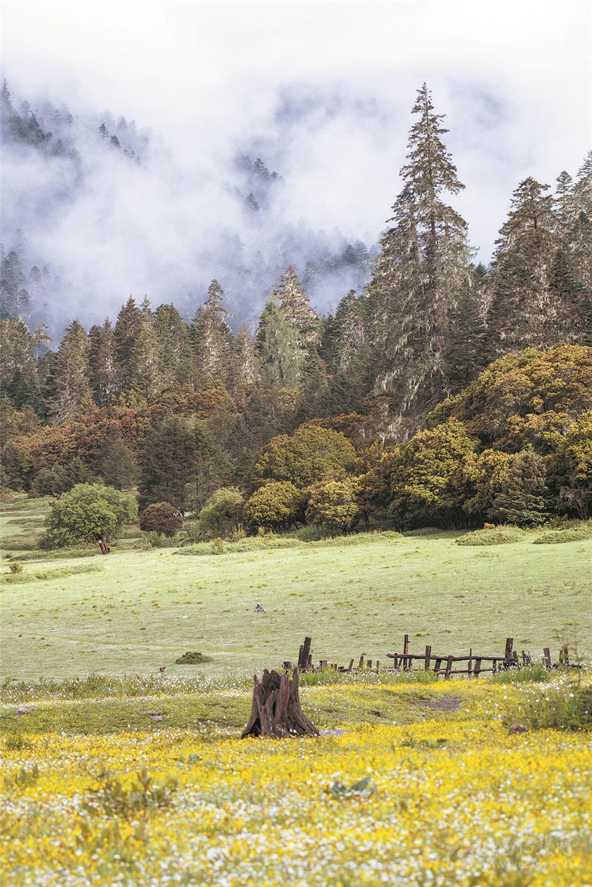 “江”與“湖”,靜臥于原始森林與草甸花海的之間,河溪清澈,湖水湛藍,真如秘密花園,人間仙境。湖畔最美的是盤根錯節(jié)的老柏樹,枝條彎曲如蒼龍,或立于湖畔,或臥于湖中,滿湖樹影、花影隨風搖曳。