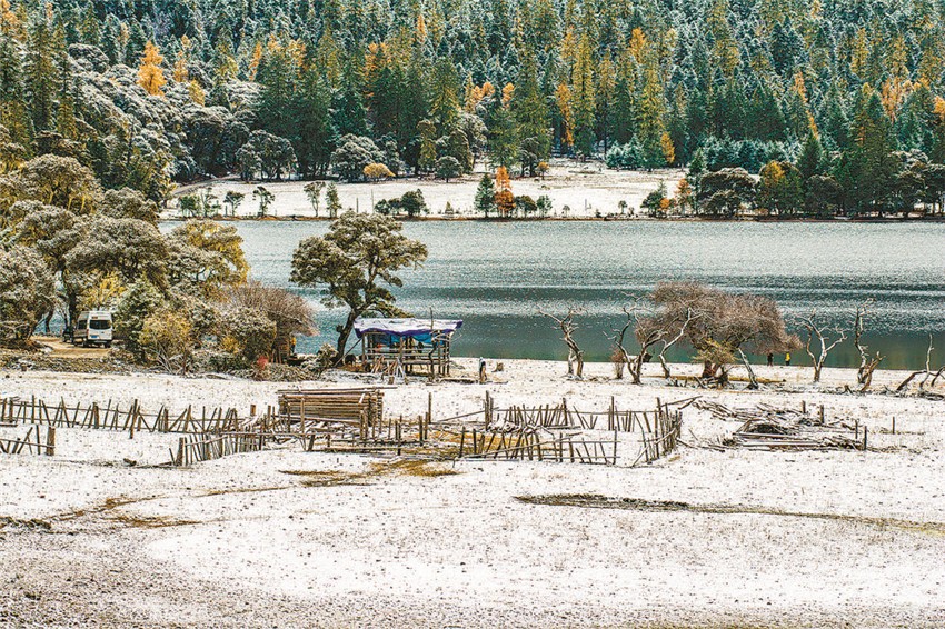 伍須海的色彩,四季都會變化,秋天最為精彩,滿湖的深綠,青黛的暗針葉林,金黃色的紅杉,火紅的槭樹,褐色的高山櫟,以及點綴于其間的沙棘果實,都五彩繽紛地點染著這張“畫布”。