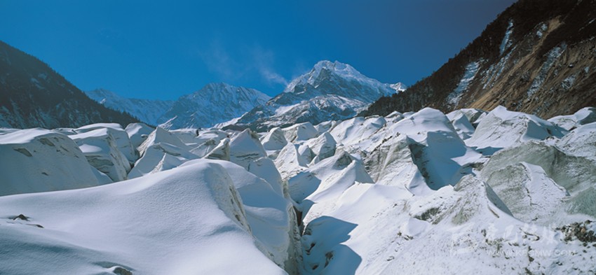 海螺溝地處橫斷山系的核心地帶,境內(nèi)延綿著眾多終年積雪、冰清玉潔的雪山。貢嘎山以雄渾的身軀屹立于香格里拉腹地,海拔7556米,被譽為“蜀山之王”,為橫斷山系的主峰,周圍林立著45座海拔6000米以上、100余座海拔5000米以上的冰峰、雪山,是世界上距離特大城市最近的極高山群。極目遠眺,群峰簇擁,貢嘎山主峰宛如一座巨大的金字塔,巍峨地屹立于群峰之巔,高大險峻、氣勢磅礴。