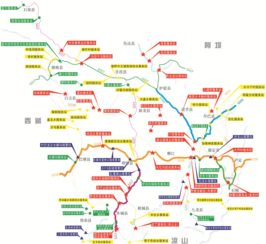 77個服務(wù)區(qū)(站、點)地處我州六條旅游線路和十條景觀大道。主要集中在:G318線(瀘定——康定——雅江——理塘——巴塘),G350線(丹巴——八美——道孚——爐霍——色達(dá)),S217線(理塘——稻城——香格里拉鎮(zhèn)——亞丁),S211線、S434線(瀘定——海螺溝——榆林)。