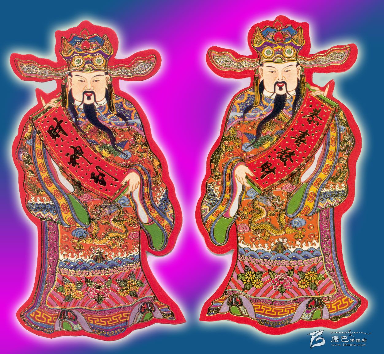 民間所供大多以趙公明居多,其印刷的形象很威武,黑面濃髯,頂盔貫甲,手中執(zhí)鞭,周圍畫有聚寶盆、大元寶、珊瑚之類的圖案,加以襯托,突出富麗華貴的效果。