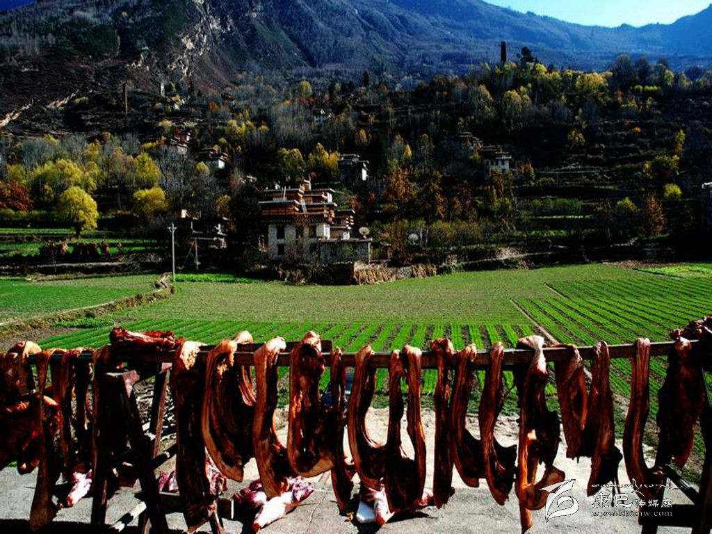 丹巴嘉絨藏族年期間,在酸菜包子、火燒饃、香豬腿等眾多的風(fēng)味飲食中,“藏香豬腿”是必不可缺的美食佳肴,也是給長輩拜年和親朋好友間互送的最佳禮品。“藏香豬腿”的制作方式也象丹巴嘉絨藏族年一樣的獨(dú)特。丹巴人宰殺年豬的方式通常有用繩索死吊或者用刀從勁入殺心臟致死兩種,現(xiàn)在采用后一種方式宰殺豬居多。當(dāng)?shù)厝藢⒇i宰殺后用熱水燙,處理好豬毛,再在胸口用刀開一孔,將手伸人胸腔扯斷心肺連接處,然后將其剖開,并把肥、瘦豬肉分離開,剝?nèi)グ逵?,處理好其他?nèi)臟,將豬腿按原形分離,爾后經(jīng)霜凍、柏枝熏、自然風(fēng)干后存放在儲(chǔ)藏室內(nèi)。豬腿存放一冬后,色、香、味俱佳。食用時(shí)煮成半熟或用炭火將表皮烘烤,切成小塊狀或撕成粉絲狀,在百米內(nèi)即可聞到香味,入口鮮嫩清香,營養(yǎng)豐富,誘人食欲。