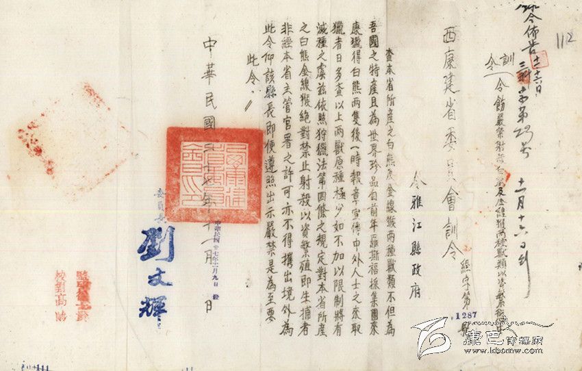 民國27年(公元1938年),“西康省建省委員會”發(fā)出“經(jīng)字第1287號”訓(xùn)令,這是一份難能可貴的保護(hù)野生動物的訓(xùn)令,訓(xùn)令說:“查本省所產(chǎn)之白熊及金線猴兩種獸類,不但為吾國之特產(chǎn),且為世界珍品。自前年羅斯福采集團(tuán)來康獵得白熊兩只后,一時報章宣傳,中外人士之來取獵者日多。查以上兩獸原種極少,如不加以限制,將有滅種之虞。茲依照狩獵法第四條之規(guī)定,對本省所產(chǎn)之白熊、金線猴絕對禁止射殺,以資繁殖。即生捕者非經(jīng)本省主管官署之許可,不得帶出境外。為此令仰該縣長即便遵照出示嚴(yán)禁是為至要,此令。”訓(xùn)令最后署有“西康建省委員會委員長劉文輝”的簽名。