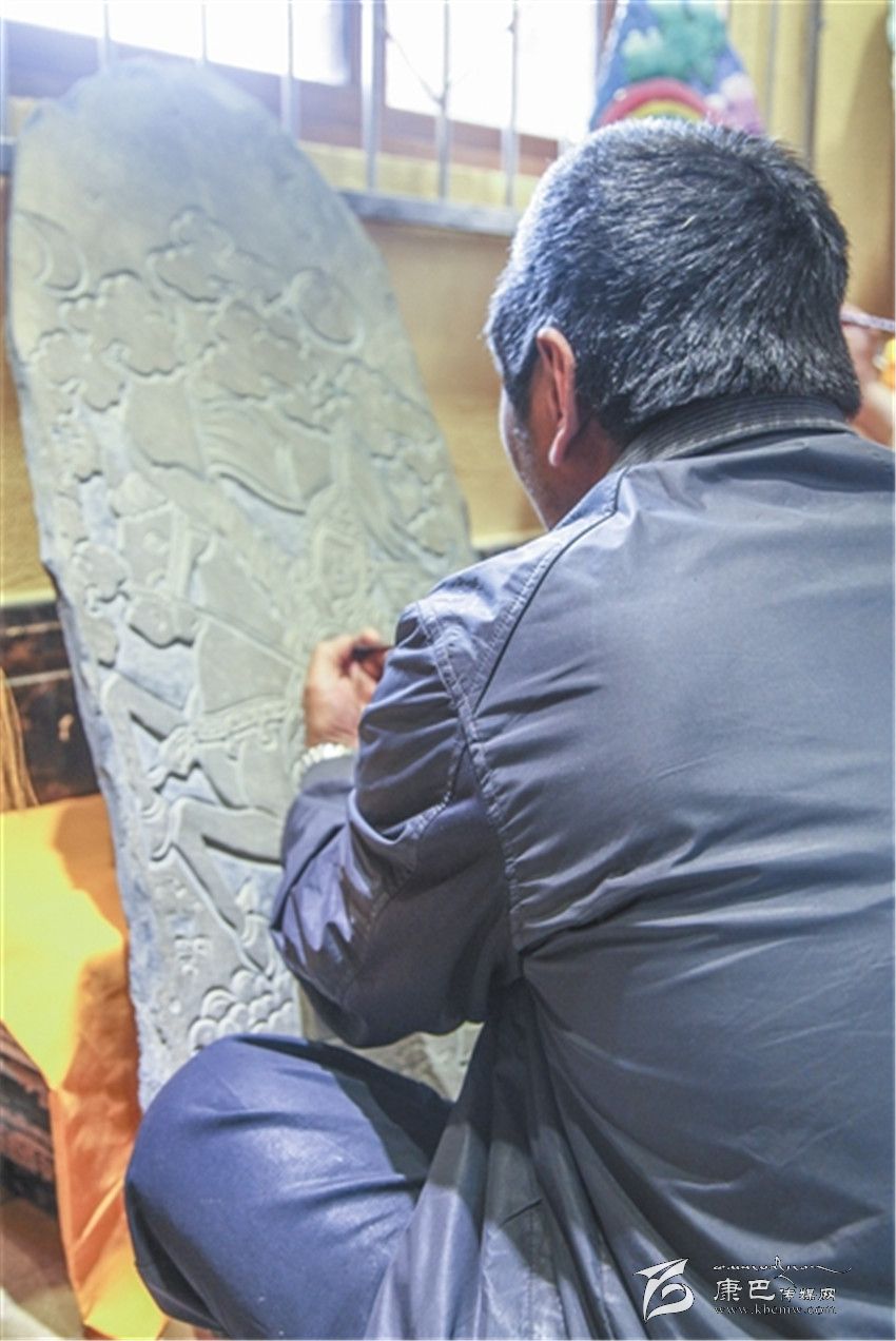 “刻一幅一米高、八十公分寬的作品,一般用時在一個月以上。”所彭接過巴德的話說,在格薩爾彩繪石刻中,最理想的尺寸就是一米高、八十公分寬。但由于各種原因,現(xiàn)在很不容易找到這么大、又適合石刻的石板。此外,也有一些人采用機器進行刻制,但這就失去了藝術(shù)的本來價值。