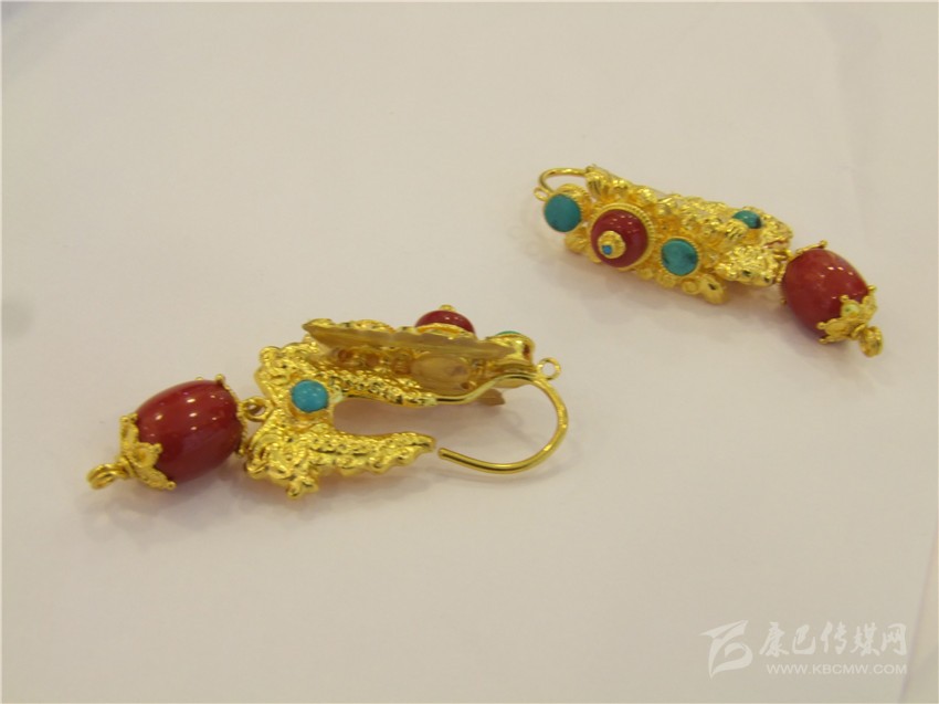 龍頭耳環(huán)在藏民族配飾歷史上較為久遠(yuǎn),設(shè)計(jì)師在遵循龍頭耳環(huán)傳統(tǒng)基礎(chǔ)上,結(jié)合當(dāng)下的潮流,用紅藍(lán)寶石做點(diǎn)綴,并在紅色寶石上打上精美的黃金花,很好的詮釋了個性與時尚的結(jié)合。