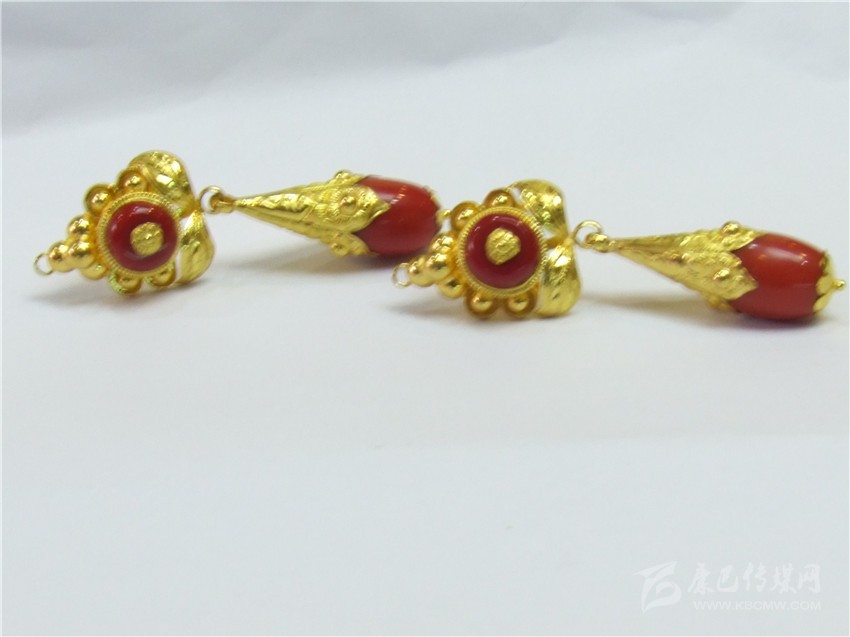 經(jīng)典的紅綠配耳環(huán)。撞色一直都是永不落伍的時尚,紅綠搭配的巧合,是藏民族熱愛生命與熱情好客的象征,用流光溢彩的金色將紅與藍(lán)包圍并連接,看起來協(xié)調(diào)而美好,搭配起來更為時尚。據(jù)店家介紹,此款耳環(huán)凈重22.75克,加上手工費(fèi),售價(jià)7000余元。