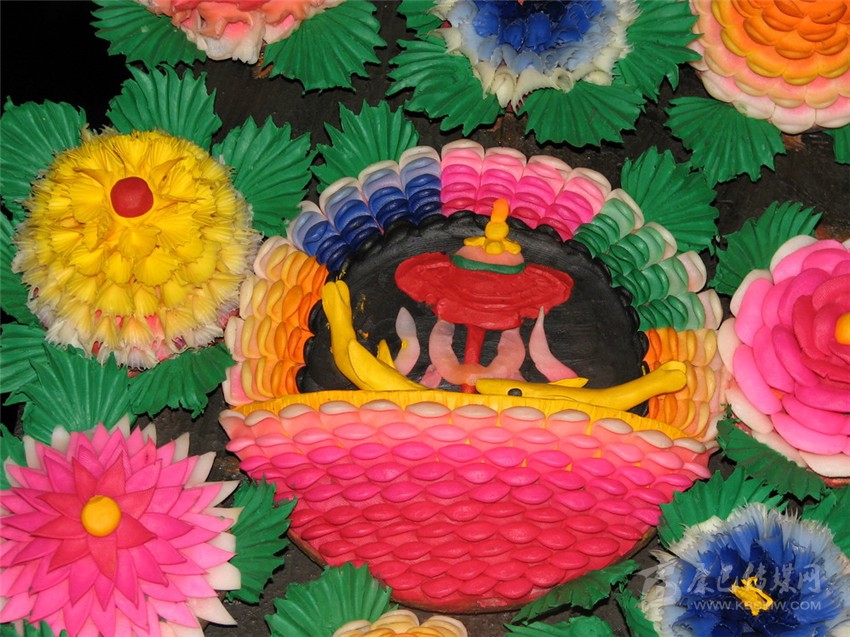 有傳說稱641年文成公主進(jìn)藏,帶去一尊釋迦牟尼12歲等身像并將其供奉于拉薩的大昭寺,當(dāng)?shù)厝罕娪盟钟妥龀苫ü┇I(xiàn)于佛前,以示崇敬之心,后各藏傳佛教寺院相繼使用,視為禮佛珍品,獻(xiàn)酥油花遂成為正月祈愿大法會的重要內(nèi)容。在發(fā)展過程中,酥油花的塑造方式、花色品種、內(nèi)容題材和工藝技巧都不斷發(fā)生著變化。