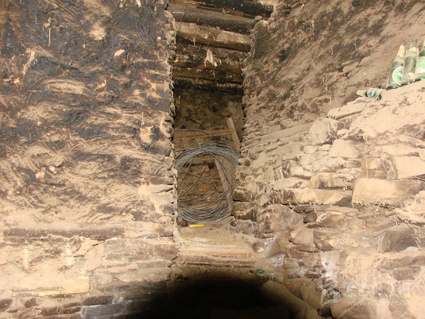 鍋莊房后,有兩道門,其中一間為放置糧食的庫(kù)房。而另一間房屋,門檻高于鍋莊房許多,需要跨上兩級(jí)臺(tái)階才能上去。門較矮小,打開房門,一股潮濕的氣味撲鼻而來(lái),眼前一片漆黑,什么也看不見(jiàn)。我打開隨聲攜帶的電筒,借助微弱的光線,勉強(qiáng)能看見(jiàn)房屋內(nèi)的擺設(shè)。房屋的右面角落里,有用木頭搭建起來(lái)的籠子,其高約一百三十厘米,寬約一百厘米。在房屋的左邊,有一曲折的甬道,也需要走上兩級(jí)臺(tái)階。牟大哥告訴我,這里是用來(lái)關(guān)押犯人的地方。
