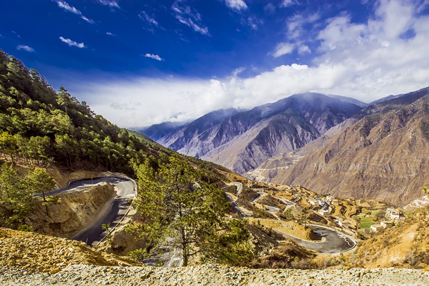 如今,所有鄉(xiāng)村通了硬化路,橫跨在金沙江上的十余座跨江大橋氣貫如虹,天塹變通途。過去我們下鄉(xiāng)時,從日雨到曲雅貢,只有一條從因都壩背后的半山腰路。蒼茫大山,路上幾乎看不見一顆大樹,也找不到一滴水源。從山腰看江畔的因都壩,只有兩戶人家,幾株綠樹總令焦渴難耐的我們望“綠”興嘆!下山走到金沙江邊,熾烈陽光從河灘上反射,火辣辣照在臉龐和皮膚,熱浪令人窒息,感覺目的地遙不可及。現(xiàn)今,干部下村完全不需要走路,走路下鄉(xiāng)對年輕人來說簡直不可思議。公路像一條飄帶環(huán)繞山間,使散落在峽谷中的村寨愈發(fā)展現(xiàn)出欣欣向榮的新風貌。