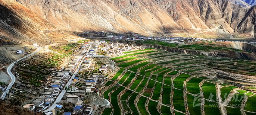 從得榮縣城出發(fā),途經(jīng)日龍鄉(xiāng),汽車順著盤山公路開始往下行駛,到半山腰處,司機輕輕踩一腳剎車熄火,在此作短暫休息。這時,我打開車門俯瞰金沙江畔的因都壩,但見公路兩側(cè)一排排整齊的房屋像火柴盒一樣連綴在平坦壩子上,房屋下端,麥田梯次舒展,麥浪涌動,蔚為壯觀。