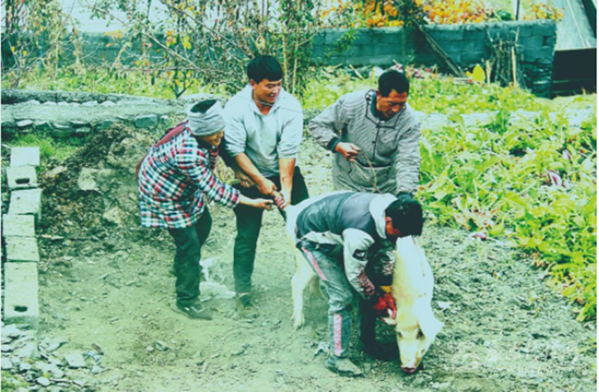 沙瑪魯石忘不掉的還有祈福和拜年。有那么一天,父親會(huì)把鄰里的小孩集中起來(lái),帶到屋后最大的一棵樹(shù)下祈求平安和健康。祭祀結(jié)束后,父親會(huì)拿出煮熟的豬蹄、甜蕎餅和豆腐,給大家分食。等到下午,孩子們就去挨家挨戶拜年。那個(gè)年代,拜年沒(méi)有紅包,小孩們拜年也沒(méi)多少講究,而大人去拜年,必須要帶酒,還要給主人家孩子發(fā)水果糖。