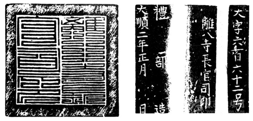 “離八寺官司印”為大西政權(quán)官印,大順二年(1645)鎏金銅制九疊篆印章。高約6CM, 規(guī)格7×7,印章正面邊款鑄文“大字六百六十二號(hào) 離八寺長(zhǎng)官司印”,側(cè)刻“禮部造 大順二年正月 日”,評(píng)為國(guó)家一級(jí)文物。史書載:“獻(xiàn)忠遍招諸土司,用降人為誘,鑄金印赍之,以易其官?!币虼丝赏茢?,此印為大西政權(quán)控制川西少數(shù)民族所鑄。