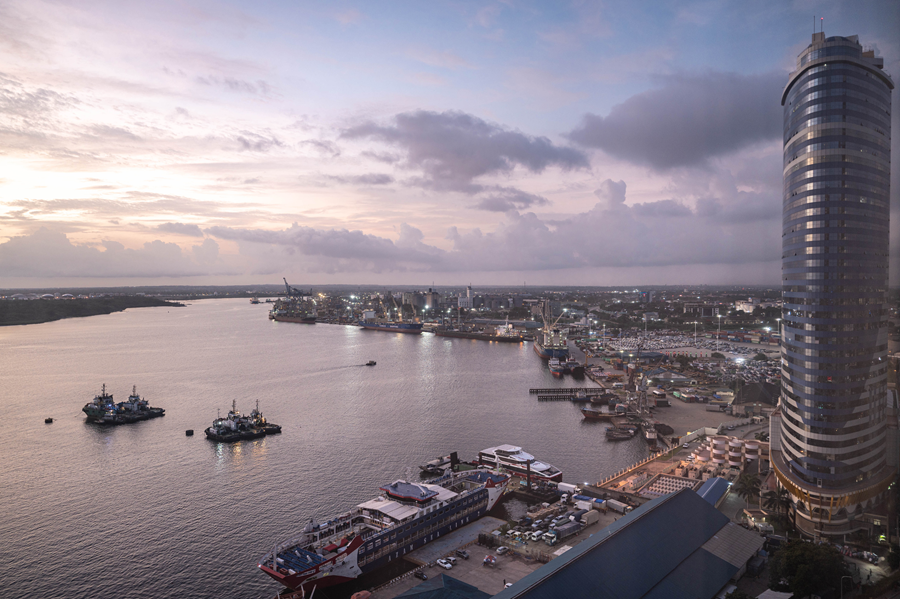 ??這是2023年12月29日拍攝的日出時分的坦桑尼亞達累斯薩拉姆港。新華社記者 王冠森 攝
