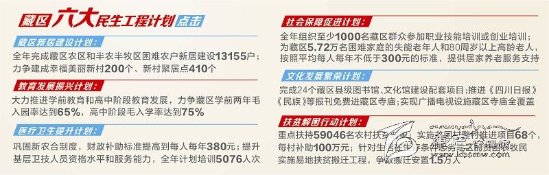 3月18日,四川省政府辦公廳印發(fā)《2015年藏區(qū)六大民生工程計劃總體工作方案》及藏區(qū)新居建設、教育發(fā)展振興、醫(yī)療衛(wèi)生提升、社會保障促進、文化發(fā)展繁榮、扶貧解困行動等六個實施方案,預計各項民生資金總投入約52.66億元(含群眾投工投勞)。今年藏區(qū)“六大民生工程計劃”亮點紛呈,其中包括取消建設性項目州縣配套資金。