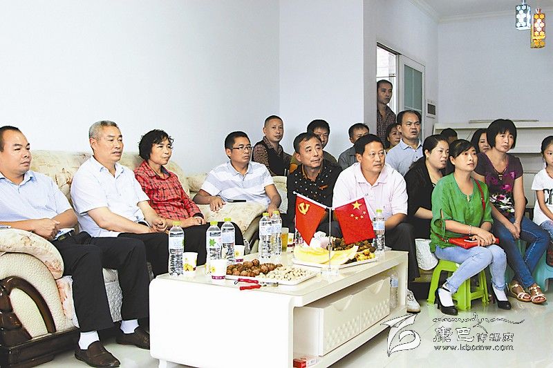 何曉莉的父親(左一)、母親(左二)和親戚好友們集聚一堂,通過電視看女兒駕機飛過天安門。