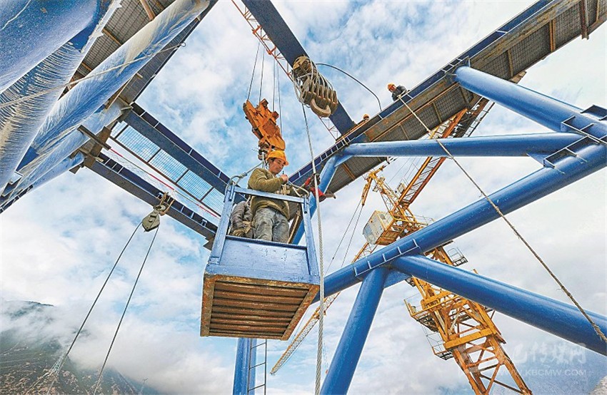 工人們在橋塔頂部調(diào)運設(shè)備。