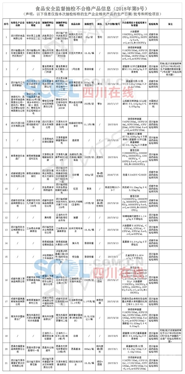 省食品藥品監(jiān)管局相關(guān)負(fù)責(zé)人表示,對上述監(jiān)督抽檢中發(fā)現(xiàn)的不合格產(chǎn)品,生產(chǎn)經(jīng)營者所在地食品藥品監(jiān)管部門已按相關(guān)規(guī)定開展核查處置,責(zé)令違法生產(chǎn)經(jīng)營者下架、召回不合格產(chǎn)品,徹查問題原因并全面整改,并責(zé)令成都、自貢、攀枝花、綿陽、遂寧、內(nèi)江、樂山、南充、廣安、達(dá)州、雅安、眉山、資陽、甘孜、涼山市(州)食品藥品監(jiān)管部門應(yīng)在2018年5月22日前向省食品藥品監(jiān)督管理局報(bào)告核查處置情況并向社會公布。
