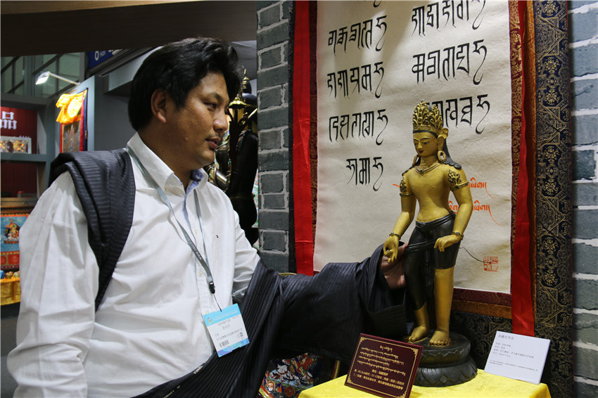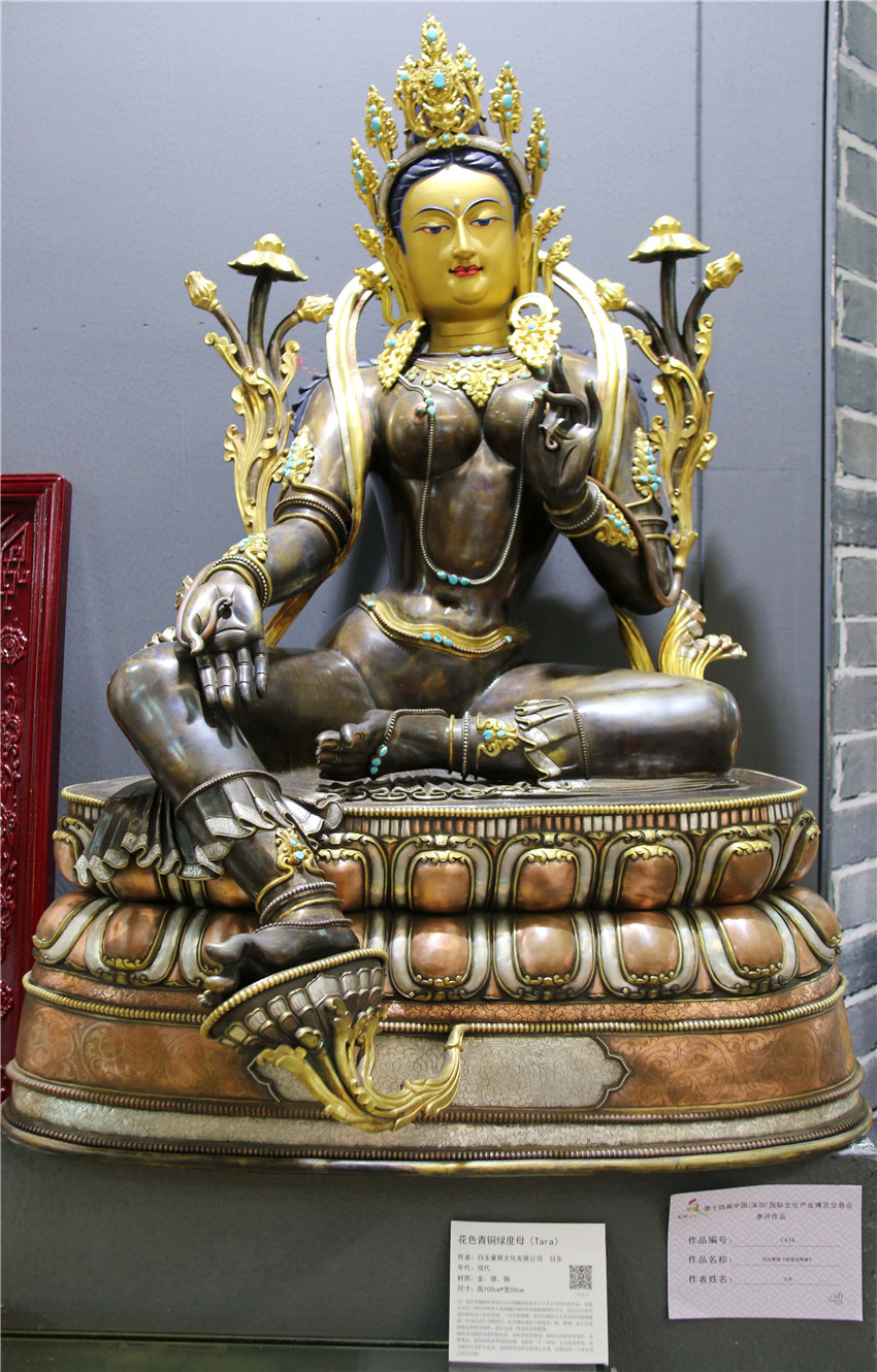 本網(wǎng)訊(記者 宋志勇 文/圖)“這是由什么材料鑄成的物件?”“這件作品的寓意是什么?”“這是一件花色青銅《綠度母佛像》,分別由金、銀、銅鑄成,高100cm、寬50cm,綠度母為觀世音菩薩的化身?!?月12日是第十四屆中國(guó)(深圳)國(guó)際文化產(chǎn)業(yè)博覽交易會(huì)第三天,甘孜展館迎來(lái)了眾多參觀者,在館內(nèi)市民正與白玉縣董察文化發(fā)展有限責(zé)任公司董事長(zhǎng)日多一問(wèn)一答。