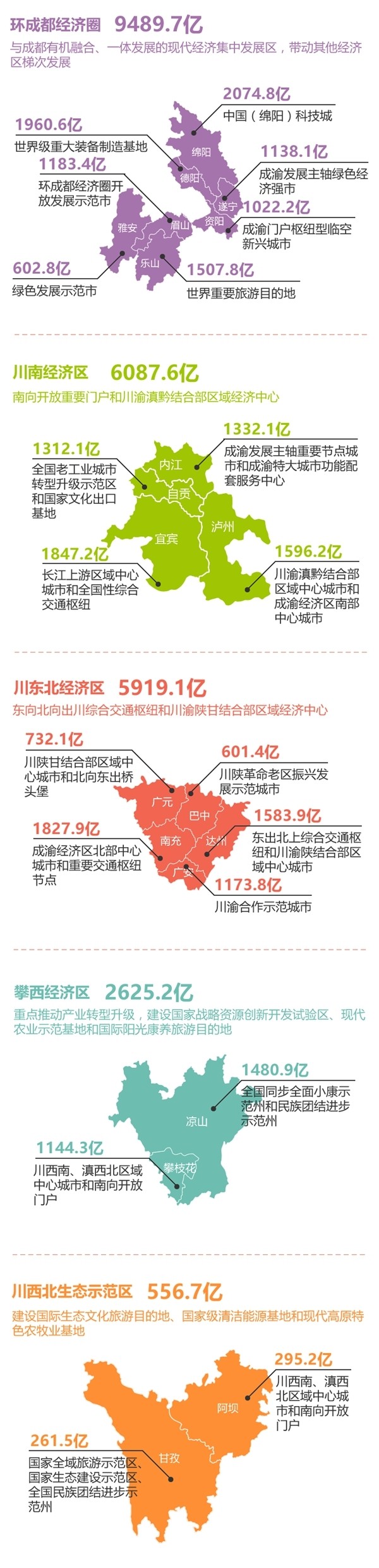 發(fā)展“多支”:環(huán)成都經(jīng)濟(jì)圈、川南經(jīng)濟(jì)區(qū)、川東北經(jīng)濟(jì)區(qū)、攀西經(jīng)濟(jì)區(qū)、川西北生態(tài)示范區(qū)。