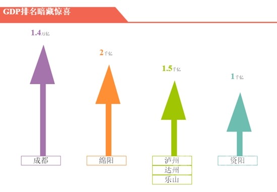 各市差距逐漸縮小,競爭勢頭只增不減。值得注意的是,雅安和巴中競爭最為激烈,二者GDP差距僅為1.4億元。1.4億元是個(gè)什么概念呢?已總投資246億元的成宜高速為例,該高速每公里投資約1.56億,也就意味著二者差距還不夠投資1公里高速公路。