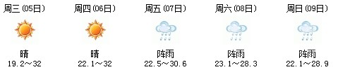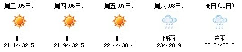 雖然明天太陽有點兇,但7日、8日、9日三天陣雨及時出現(xiàn),日最高氣溫穩(wěn)定在30℃附近。