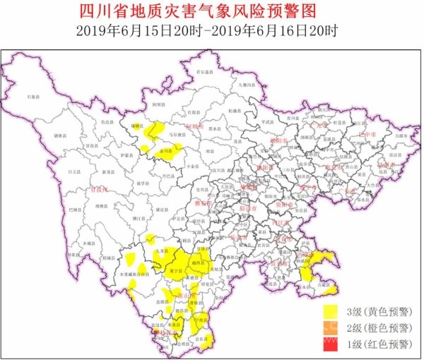 四川在線消息(記者 寇敏芳)6月15日,省自然資源廳發(fā)布全省地災(zāi)氣象風(fēng)險預(yù)警。結(jié)合四川省氣象臺天氣預(yù)報情況,6月15日20時~6月16日20時,全省地質(zhì)災(zāi)害氣象風(fēng)險預(yù)警等級為3級(黃色預(yù)警,注意級),具體結(jié)果如下: