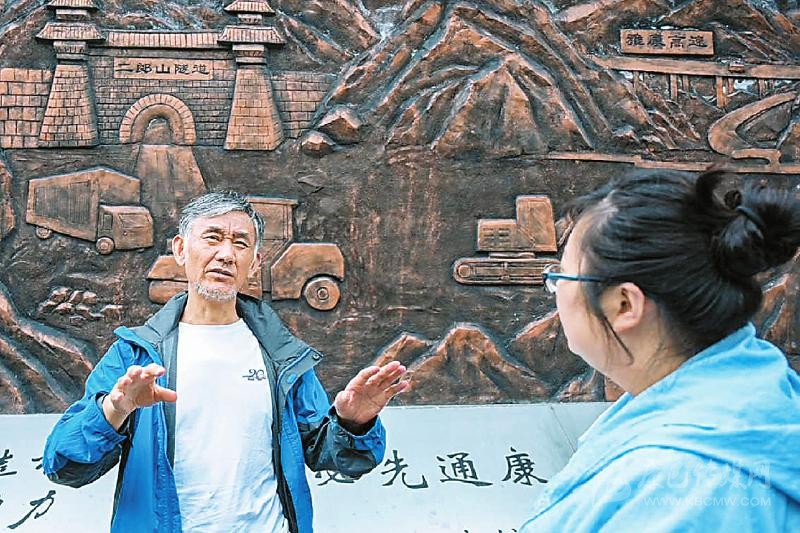 老二郎山隧道外,川報老記者林衛(wèi)(左)回憶當(dāng)年的采訪情景。