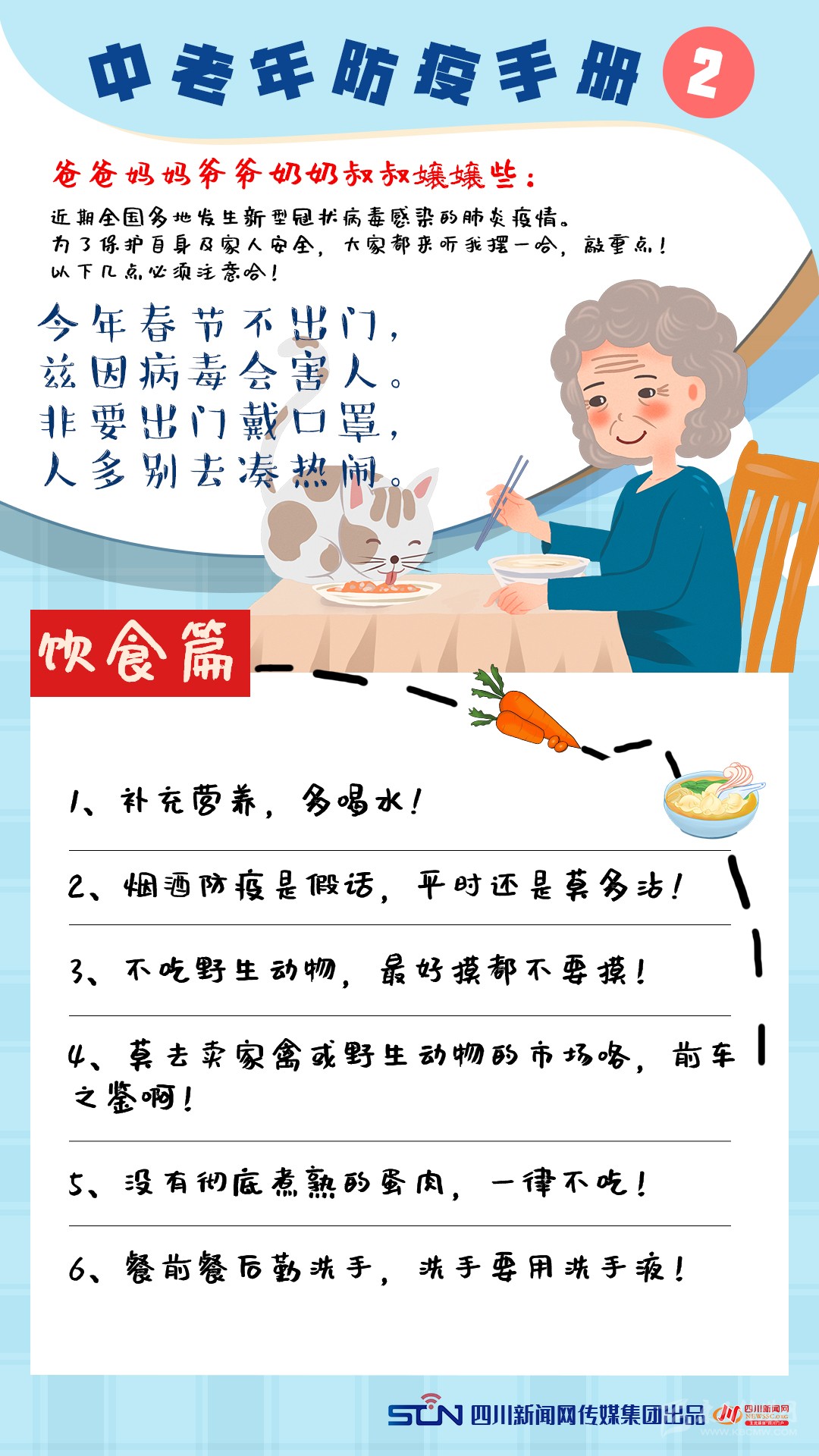 對(duì)此,為了讓“這屆難帶的父母”進(jìn)一步認(rèn)識(shí)新型冠狀病毒感染的肺炎疫情,四川新聞網(wǎng)特別推出《中老年防疫手冊(cè)》,呼吁老年人重視疫情,科學(xué)防控,做好自己健康的第一責(zé)任人。還在等什么,快轉(zhuǎn)給你那“倔強(qiáng)”的父母吧!