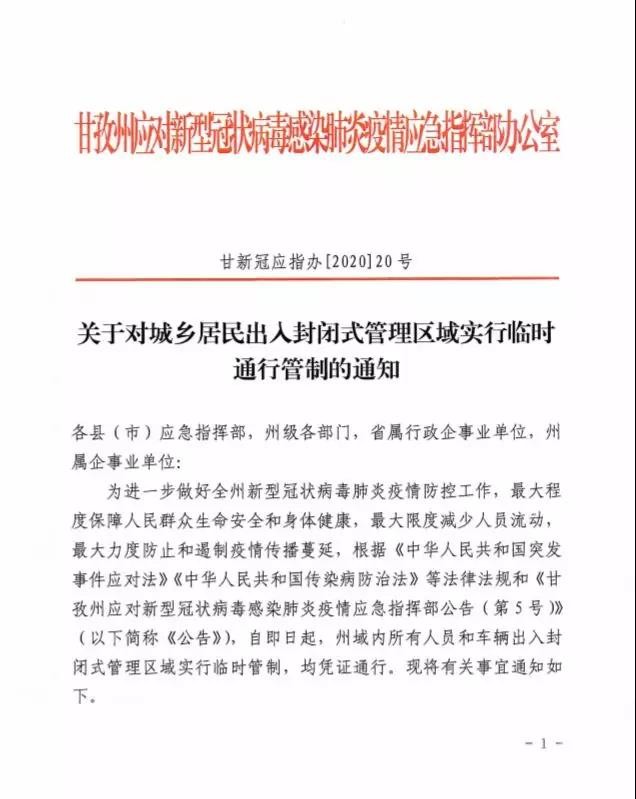 為進(jìn)一步做好全州新型冠狀病毒肺炎疫情防控工作,最大程度保障人民群眾生命安全和身體健康,最大限度減少人員流動(dòng)最大力度防止和遏制疫情傳播蔓延,根據(jù)《中華人民共和國突發(fā)事件應(yīng)對(duì)法》《中華人民共和國傳染病防治法》等法律法規(guī)和《甘孜州應(yīng)對(duì)新型冠狀病毒感染肺炎疫情應(yīng)急指揮部公告(第5號(hào))》(以下簡(jiǎn)稱《公告》),自即日起,州域內(nèi)所有人員和車輛出入封閉式管理區(qū)域?qū)嵭信R時(shí)管制,均憑證通行。現(xiàn)將有關(guān)事宜通知如下。