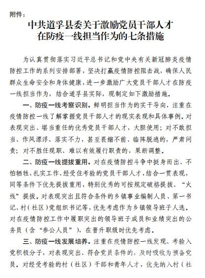 疾風(fēng)知?jiǎng)挪?,板蕩識(shí)誠(chéng)臣。自新型冠狀病毒肺炎疫情防控阻擊戰(zhàn)打響以來(lái),道孚縣各級(jí)黨組織和黨員、干部主動(dòng)擔(dān)當(dāng)作為,積極投入疫情防控最前線,為有力防控疫情蔓延作出重要貢獻(xiàn)。近日,道孚縣委印發(fā)《中共道孚縣委關(guān)于激勵(lì)黨員干部人才在防疫一線擔(dān)當(dāng)作為的七條措施》,關(guān)心關(guān)愛(ài)、激勵(lì)引導(dǎo)廣大黨員、干部、各類人才在疫情防控一線履職盡責(zé)、擔(dān)當(dāng)作為、安心戰(zhàn)斗。