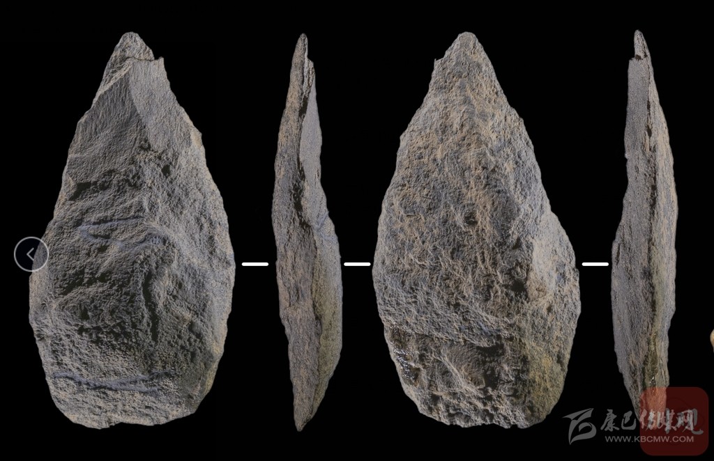 這件手斧,在東亞地區(qū)都可稱得上非常精美的一件。手斧加工比礫石石器更加復雜。古人通過對石塊兩側(cè)進行敲打,最后形成兩面對稱的手斧。手斧也是史前時代第一種兩面打制、加工精細的重型工具,在非洲發(fā)現(xiàn)的巨型手斧有的近30厘米長。早期的手斧打制較粗糙,到晚期,石器加工技術有了很大的進步。手斧器形較為規(guī)整,加工精湛。手斧的使用價值非常大,早期人類多用來挖掘根莖、加工木頭、刮獸皮,也用于宰殺大、小獵物和割剝獸皮,被稱作遠古人類的“瑞士軍刀”。