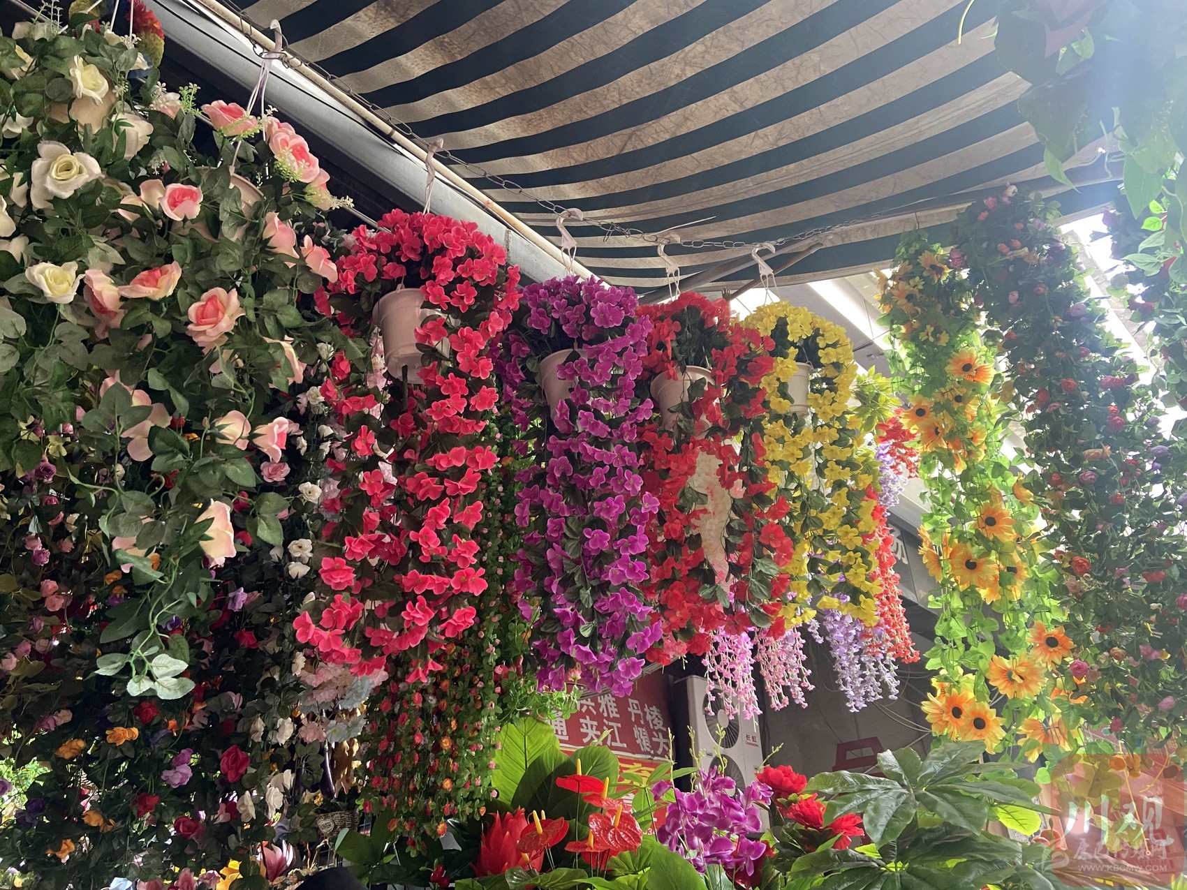 在荷花池批發(fā)市場的一家假花店,幾個(gè)嬢嬢正七嘴八舌地指揮老板在從天花板垂下來的枝條中,選出最亮眼的那叢。