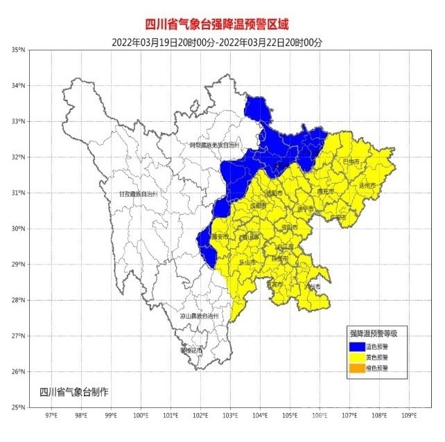 3月18日下午以來,四川省成都、南充、廣元、眉山、內(nèi)江、綿陽(yáng)、雅安、遂寧、樂山、瀘州、資陽(yáng)、眉山、宜賓13市都發(fā)布了強(qiáng)降溫黃色預(yù)警,德陽(yáng)、巴中2市發(fā)布了強(qiáng)降溫藍(lán)色預(yù)警,廣安、內(nèi)江2市于3月19日升級(jí)發(fā)布了強(qiáng)降溫黃色預(yù)警。