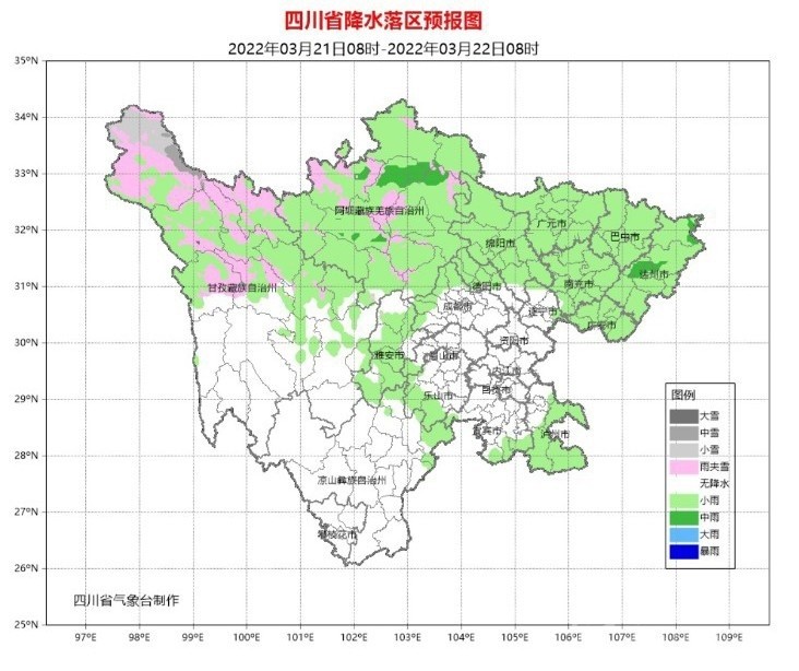 21日白天到晚上,盆地各市陰天間多云,廣元、綿陽(yáng)、德陽(yáng)、巴中、達(dá)州、南充、廣安、瀘州、雅安9市和成都西部、樂山南部有小雨,其中達(dá)州局部有中雨;阿壩州和甘孜州北部、涼山州東北部多云間陰有陣雨(雪),局地中雨(雪),甘孜州南部和攀西其余地方多云見晴。