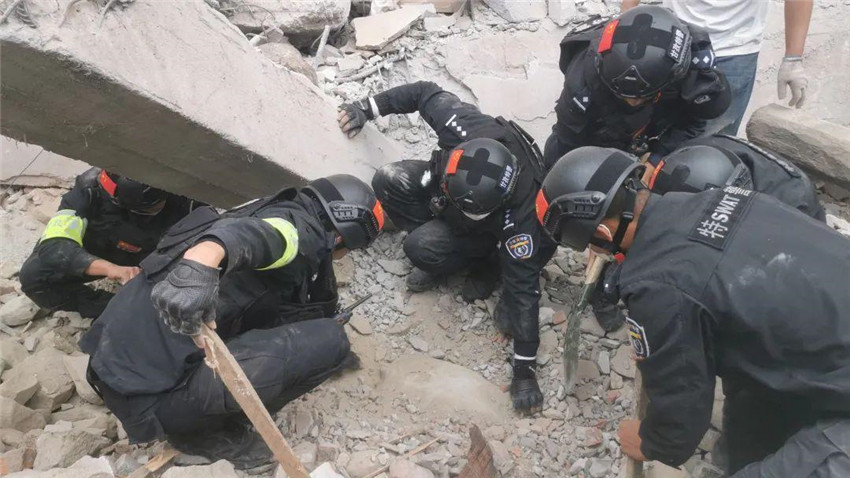 14時20分,翻山越嶺奔襲的240名甘孜特警抵達磨西鎮(zhèn)?!熬驮谶@兒!”“就在這兒!”15時左右,幾名特警來到海螺溝一處大型搜救設備無法進入的區(qū)域,為避免鐵鍬傷人,硬是徒手刨土,從斷壁殘垣間救出一名被困群眾,緊急送往醫(yī)院搶救。