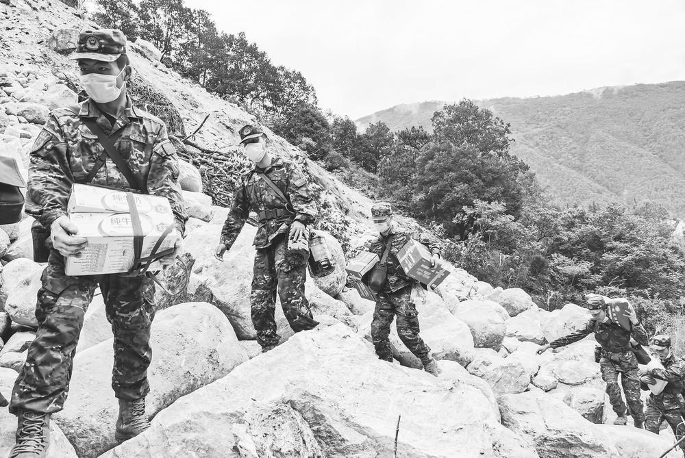 在地震發(fā)生后的48小時(shí)內(nèi),救援隊(duì)伍拼盡全力在水流湍急的河面搭設(shè)便橋,在不可能通行的地方,奮力開(kāi)辟出一條生命通道,一箱箱應(yīng)急救援物資靠肩扛人背送往共和村,部分急需轉(zhuǎn)移的鄉(xiāng)親被一支支救援隊(duì)伍及時(shí)送到安全地帶,妥善安置。