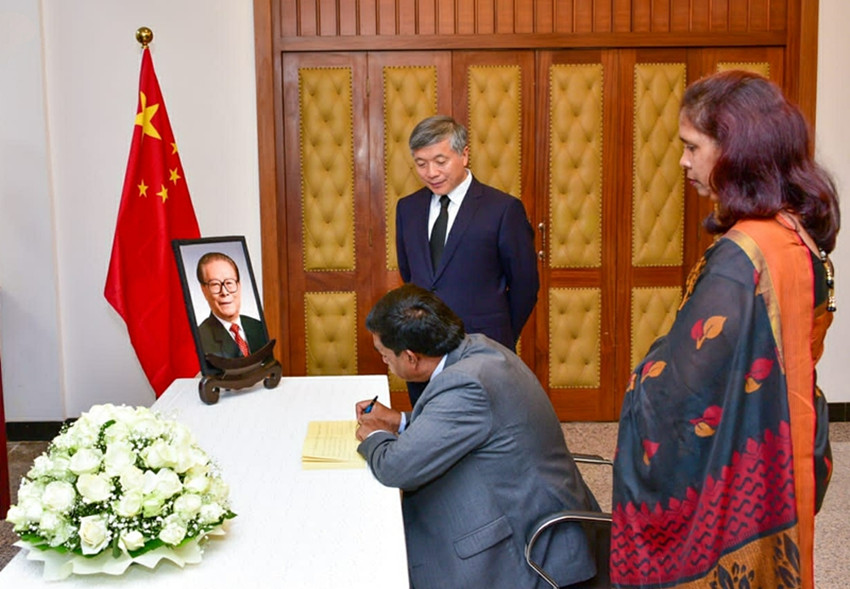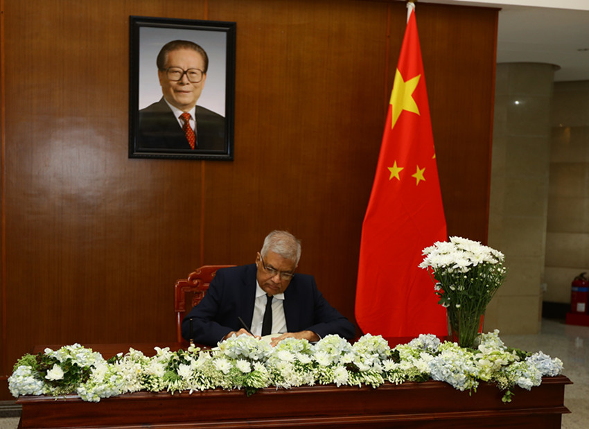 十二月二日,斯里蘭卡總統(tǒng)維克拉馬辛哈在中國(guó)駐斯里蘭卡大使館吊唁江澤民同志。 薩米拉 攝(新華社 發(fā))