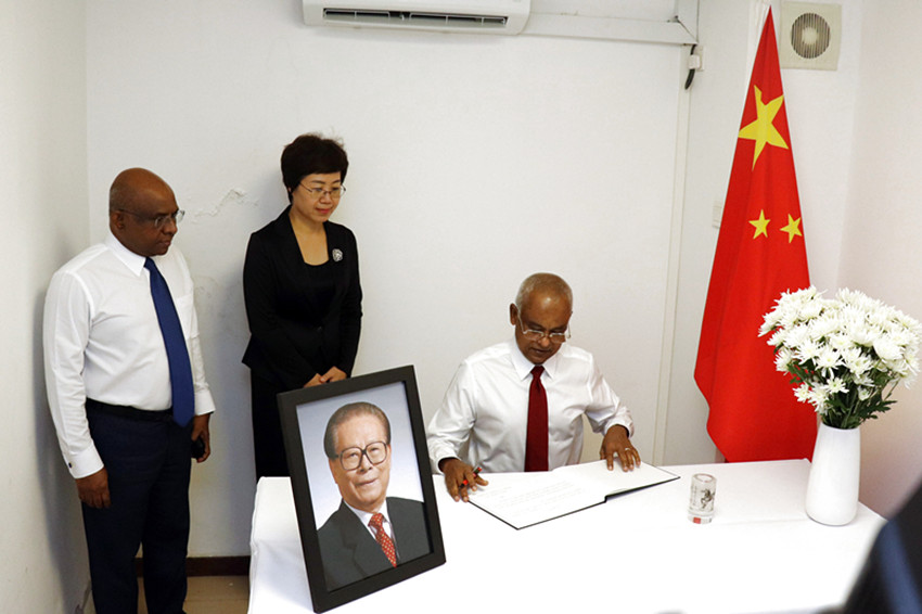 12月5日,馬爾代夫總統(tǒng)薩利赫(右)在中國(guó)駐馬爾代夫大使館吊唁江澤民同志。 中國(guó)駐馬爾代夫大使館供圖(新華社 發(fā))
