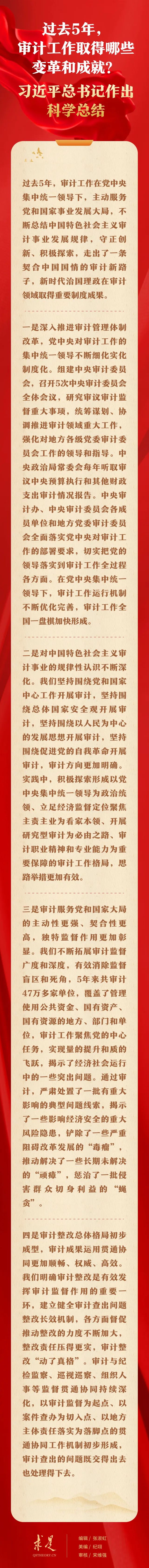 11月1日出版的第21期《求是》雜志刊發(fā)習近平總書記重要文章《在二十屆中央審計委員會第一次會議上的講話》。在這篇重要文章中,習近平總書記從4個方面對過去5年的審計工作進行科學總結,強調:“審計工作取得的這些變革和成就,是新時代中國特色社會主義思想在審計領域的具體實踐,彰顯了黨的創(chuàng)新理論的真理力量,具有鮮明的時代性和實踐性。要總結好、運用好黨關于新時代審計工作的理論成果和實踐成果,長期堅持并不斷豐富發(fā)展,指導審計工作實現(xiàn)更大作為?!?/p>