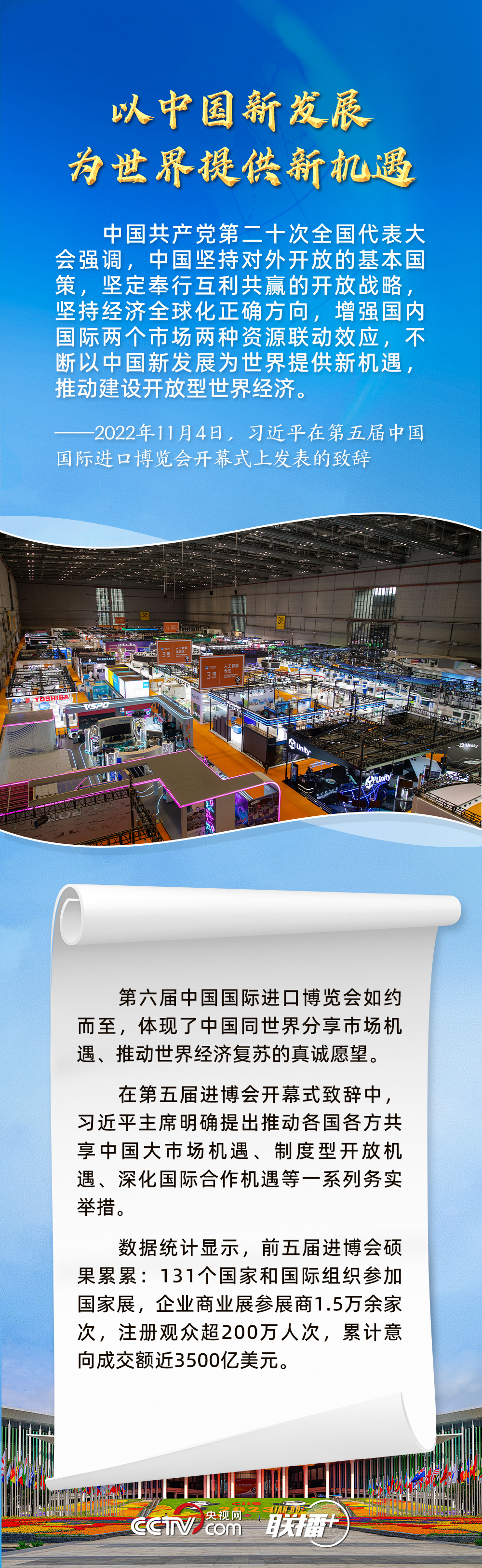 聯(lián)播+11月5日,第六屆中國國際進(jìn)口博覽會(huì)在上海開幕。習(xí)近平主席在致信中指出,2018年以來,進(jìn)博會(huì)成功舉辦五屆,依托中國大市場優(yōu)勢,發(fā)揮國際采購、投資促進(jìn)、人文交流、開放合作平臺(tái)功能,對加快構(gòu)建新發(fā)展格局和推動(dòng)世界經(jīng)濟(jì)發(fā)展作出了積極貢獻(xiàn)。