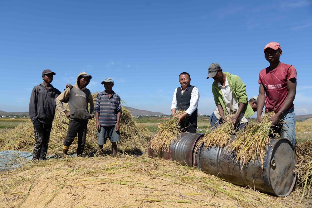 在馬達加斯加首都塔那那利佛附近的馬義奇鎮(zhèn),中國雜交水稻技術專家胡月舫(右三)在中國國家雜交水稻工程技術研究中心非洲分中心的試驗田里和當?shù)剞r(nóng)民一起收獲水稻(2023年5月12日攝)。新華社發(fā)(西塔卡·拉喬納里松攝)
